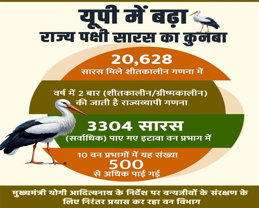 योगी सरकार की ओर से वन व वन्यजीवों के संरक्षण की दिशा में बढ़ाया गया कदम कारगर साबित हो रहा है। सरकार के प्रयासों का असर है कि उत्तर प्रदेश में साल दर साल राज्य पक्षी सारस का कुनबा बढ़ता जा रहा है। राज्य में प्रतिवर्ष दो बार (ग्रीष्मकालीन/शीतकालीन) सारस की गणना की जाती है। प्रदेश के 68 वन प्रभागों में हुई शीतकालीन गणना में कुल 20,628 सारस पाए गए। पिछले वर्ष हुई गणना में प्रदेश में सारसों की संख्या 19,994 थी। राज्यव्यापी गणना में इटावा वन प्रभाग में सर्वाधिक 3304 सारस मिले। 10 वन प्रभागों में यह संख्या 500 से अधिक रही। प्रदेश में शीतकालीन गणना कार्यक्रम में 10 हजार नागरिकों द्वारा भाग लिया गया।
